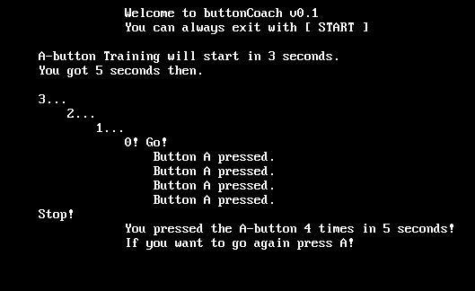 When it starts it counts down (3 seconds). Then you get 5 seconds to press A as fast as you can. My best score is 48 times so far :mrgreen: