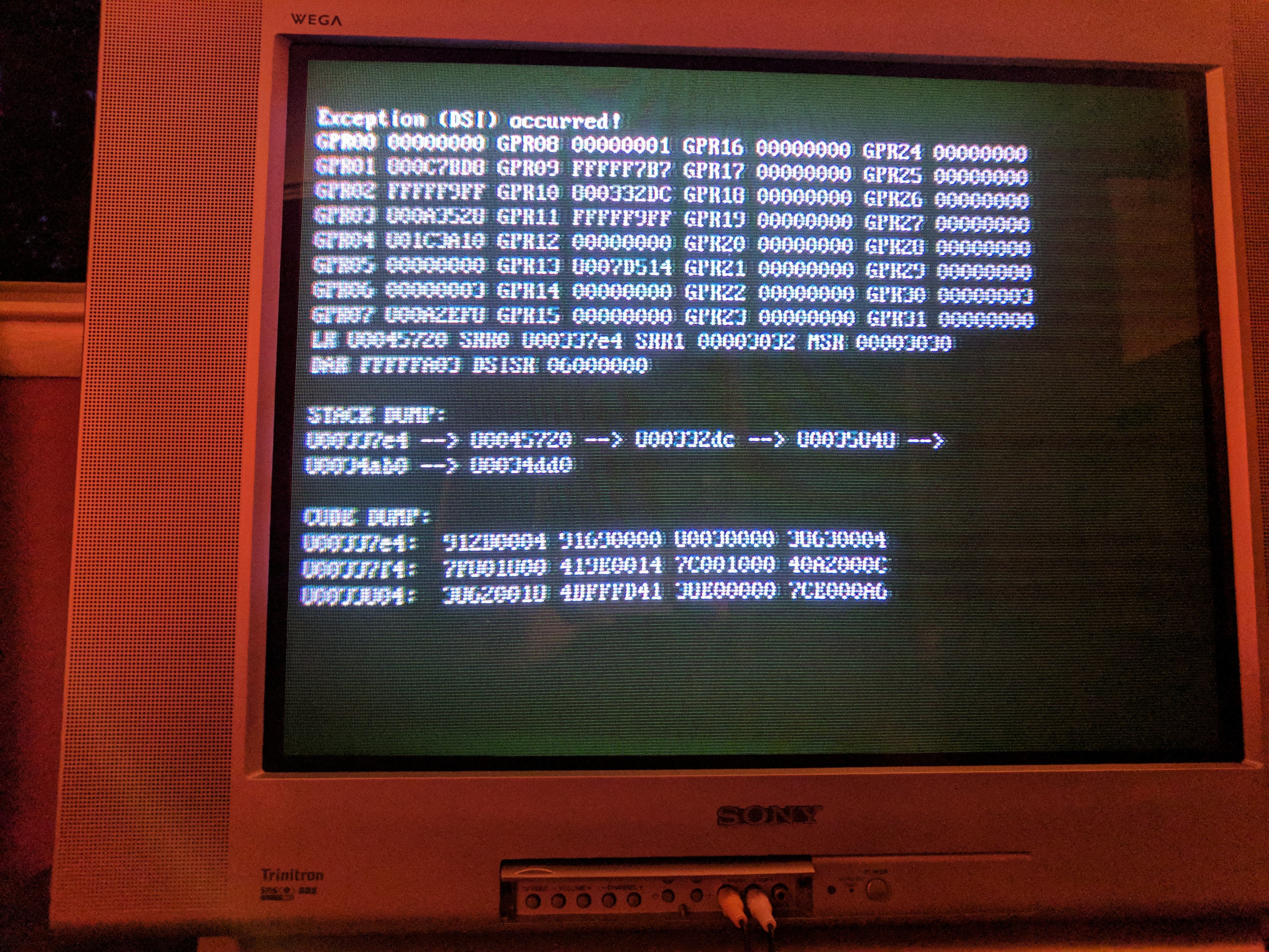 I tried growing bootldr.dol by both 1024 bytes total (including the appended .cli file) and 1024 bytes in addition to the appended .cli file, and neither worked. I was using the truncate command btw.claywilson95 wrote:Could I somehow do that after I have already created the ISO? In GCRebuilder maybe? I'm clearly not as understanding about all this as you are haha, this has taken me a little while to get the hang of blindly.Extrems wrote:That's the GC-Linux apploader panicking from the oversized DOL for the CLI append hack. Try appending 1024 null bytes.