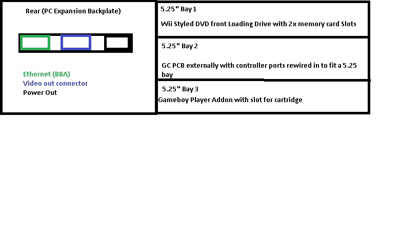 -Place a Wii front loading disc drive, 2x memory card slots, and game boy player adapter, and place them in their own enclosed 2-3 5.25" bays (possibly shove (if WII styled disc drive) and memory cards in one 5.25" , main board in another, and GC Player/bottom connectors in the lower 5.25" bay.