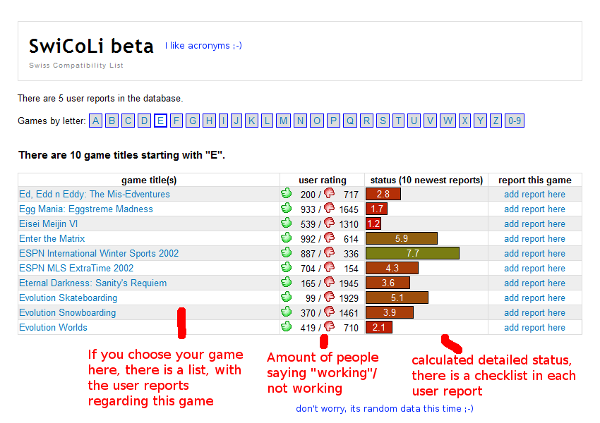 I also suggest separating the lists for testing on Wii and Gamecube that way it is REALLY less confusing. Also adding a color code legend that would be like: green is working perfectly, blue is working with some problems, grey is untested and red is not working at all