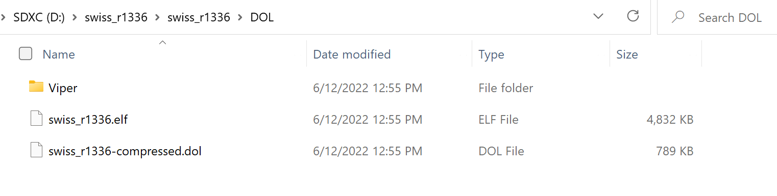 Based on what I'd read, I went into the DOL folder in order to copy the uncompressed DOL file from there, copy to the SD Card root, and name to igr.dol. As you can see from the attached screenshot, for whatever reason, there is not an uncompressed version of that file in that folder. Therefore, first I tried copying the IPL.dol file that was already on the root of the SD card and re-naming the copy to igr.dol (after enabling in-game resets within the Swiss menu). However, when I was in a game and tried in-game reset, it would put me to the GameCube menu and not Swiss.