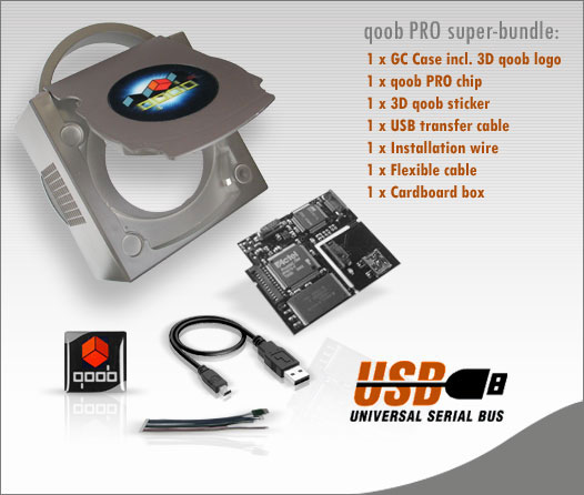 Qoob Pro & Qoob SX were modchips produced for the Nintendo Gamecube, very similar in features to the Viper GC series, each acting as an IPL replacement, with 128Kb and 2Mb programmable ROM receptively. The Qoob Pro was an improved variant of the tmbinc ipl replacement with added security, USB flashing support for the Pro series and DVD/ELF flashing for the SX. It was initially bundled with a full size case replacement for around $99 USD and sold very well.
